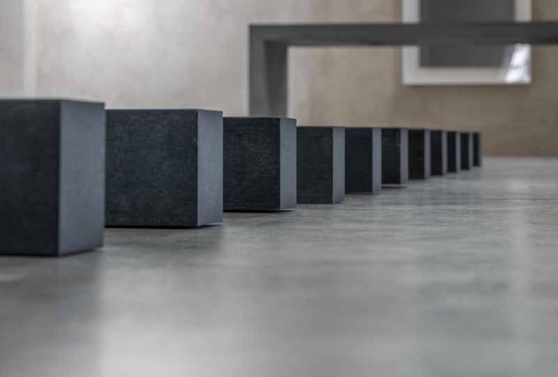 Wer die im Kirchenraum positionierte Bodenskulptur „passiert“, wird von Maß und Rhythmus, gleichzeitig mit Material konfrontiert, das in der Feingestalt seiner Oberfläche eine Vielzahl in Klarheit erfahrbar macht. Die Arbeiten an den Wänden auf Aluminium und MDF erscheinen dem wachen Auge damit nicht mehr nur schwarz, sondern in ihrer Sensibilität dem Licht und dem Raum gegenüber von einer im Sinn des Wortes bezeichnenden Vielfalt.